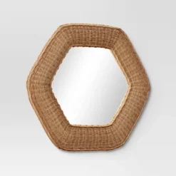 Instantly uplift your home interior with this Woven Wall Mirror from Threshold™. This wall mirror features a metal frame with woven detailing for rustic charm, while the hexagonal design adds a unique look to your space. Easy to mount on a wall, this woven mirror is perfect for adding to your entryway, living room, bathroom, or bedroom to check your appearance before heading out.